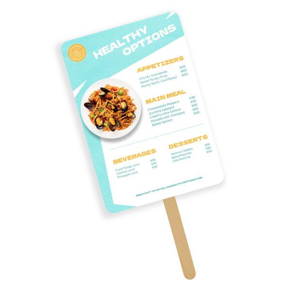 Abanico circular para empresas personalizado perfecto para tu negocio, sirve como elemento para promocionar tu marca dar a a conocer información. Hechos en Papel foldcote con paleta de madera.