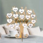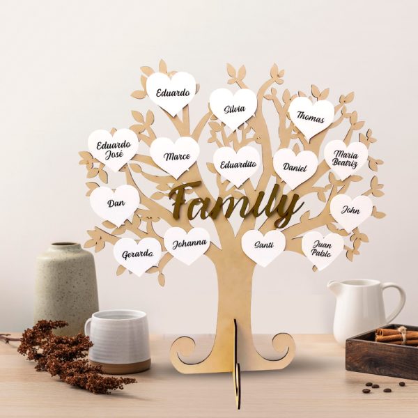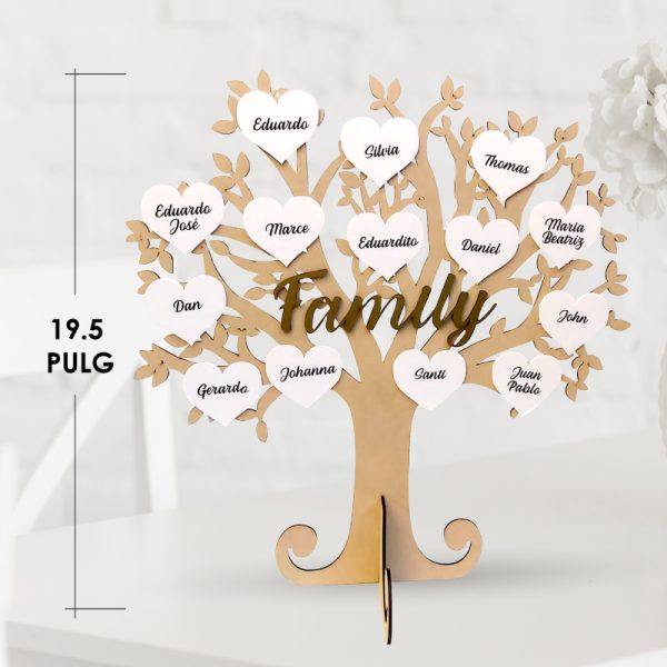 Árbol troquelado personalizado con los nombres de tu grupo familiar, será un hermoso regalo. El árbol mide 19.5 pulgadas de altura y 18 pulgadas ancho en material MDF y corazones en trovicel de 3mm de grosor.