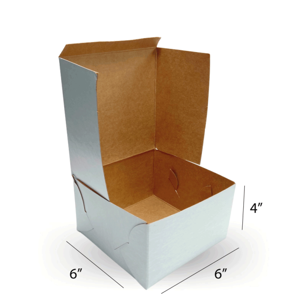 Caja blanca de 6x6x4 pulgadas en foldcote sin impresión lista para llevar, puedes usarla para postres, alimentos o regalos. Si necesitas personalizarla puedes colocarle una viñeta o sticker (busca en la sección de Viñetas y agrega a la carretilla).