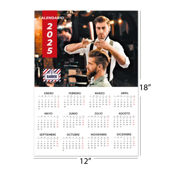 Calendario 2025 tipo afiche 12×18 pulgadas en material foldcote impreso a color con la imagen de tu negocio o marca, con perforación para colocar en pared.