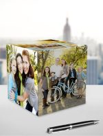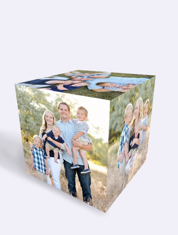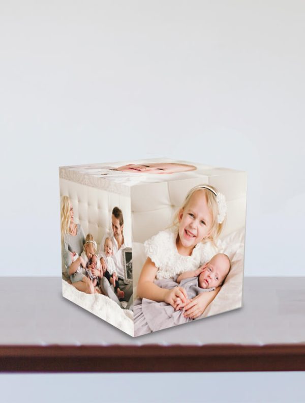 Cubo fotográfico de 4×4 pulgadas ¡Una forma original de exhibir tus fotos!, es un cubo de madera en el que se adherirán 6 imágenes o fotografías de tu selección en papel adhesivo brillante, una por cada cara.