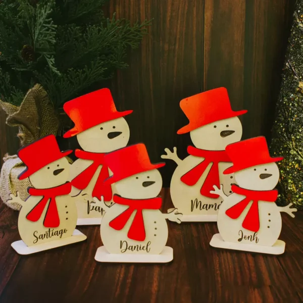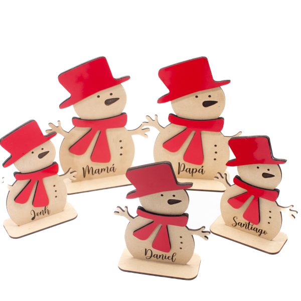 La familia de Snowmans son 5 piezas corte láser en material biodegradable, incluye el grabado personalizado. Hermoso detalle para regalar en Navidad.