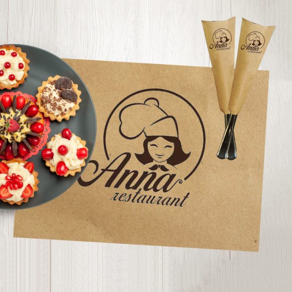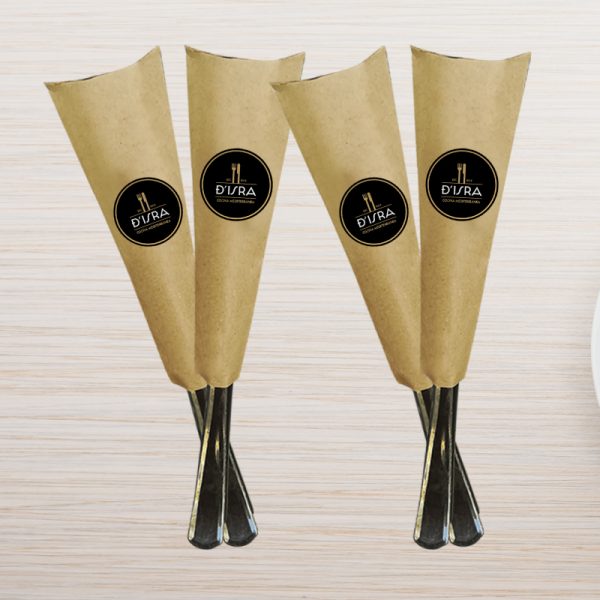 Juego de porta cubiertos en papel craft con impresión full color digital personalizada, impresiona a tus clientes colocando tu marca en cada detalle.