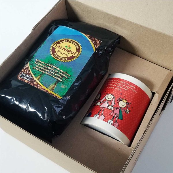 La promoción es de un Kit de regalo que incluye una taza blanca personalizada, bolsa de cafe premium 1 Lb en caja con viñeta personalizada.
