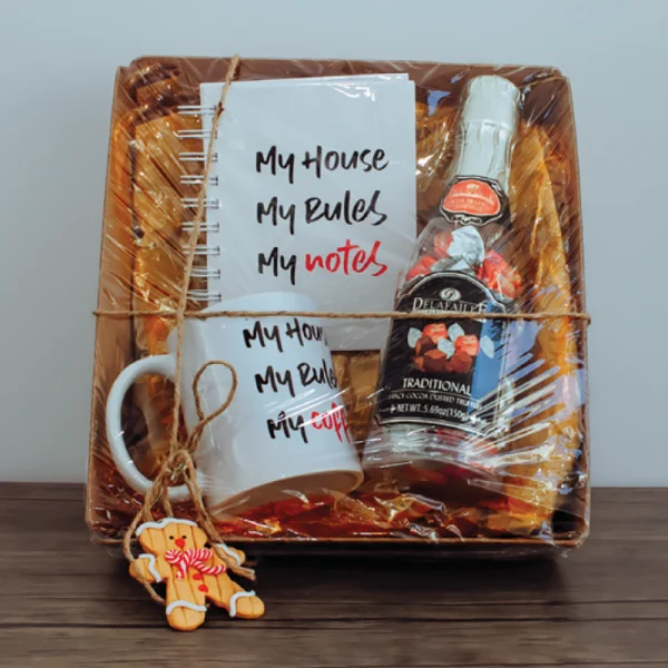 Kit de regalo personalizado taza + agenda pasta dura + botella con trufas