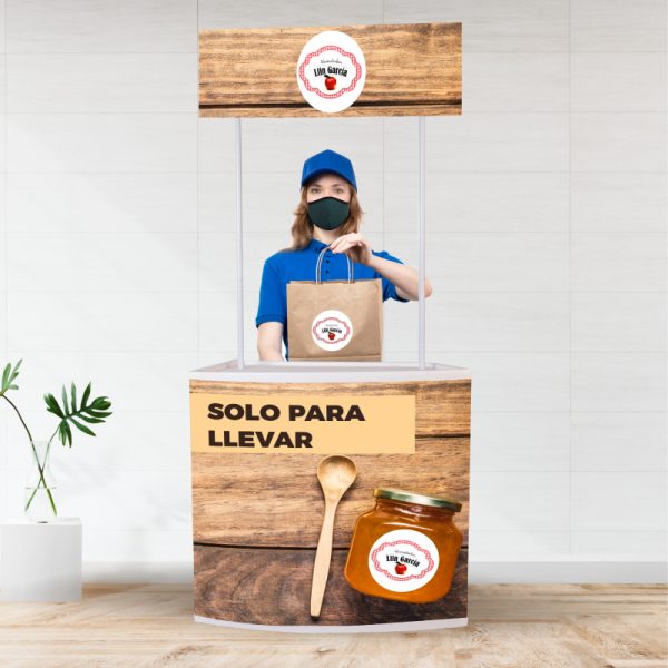 Práctica mesa degustadora que puedes personalizar con el logo de una marca o producto en la parte de superior e inferior. La mesa de 2.05 mt de altura es fácil de armar y trasladar, en material plástico resistente y fácil de limpiar.