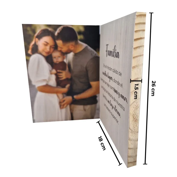 Portarretrato de madera 18 cm de ancho x 26 cm de alto y un grosor de 1.5 cm.