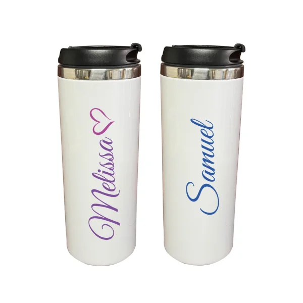 Squeeze blanco metálico personalizado de 450 ml, material resistente a bebidas frias y calientes, fácil de usar, ideal para camping, senderismo, viajes y para usar en casa u oficina.
